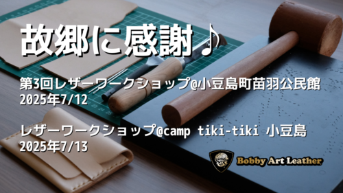 レザーはエイジング、心はアンチエイジング♪手仕事が生み出す”美”と”機能”を兼ね備えた”唯一無二”のROCK系レザーアイテムを提供するBobby Art Leather®︎[ボビーアートレザー®︎]代表レザーアートクリエ … 続きを読む 故郷に感謝♪第3回レザーワークショップ@小豆島町苗羽公民館 2025年7/12・@camp tiki-tiki 小豆島 2025年7/13
