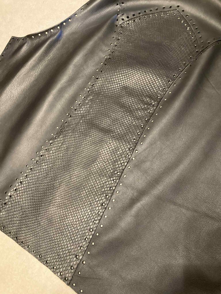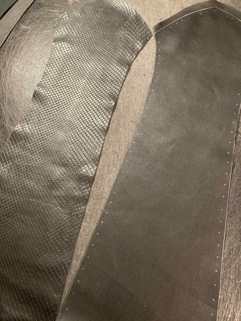 薄いエキゾチックレザーをレザーに貼って補強します