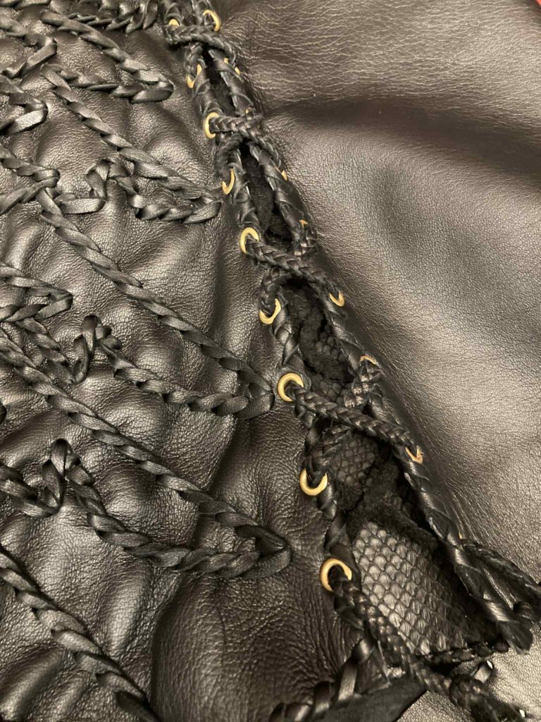両脇を革紐で編み込んで繋ぎ合わせ真鍮製のハトメを取り付けます。