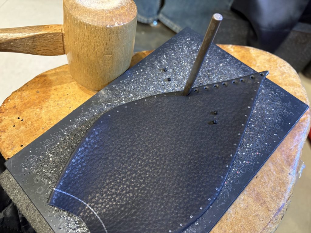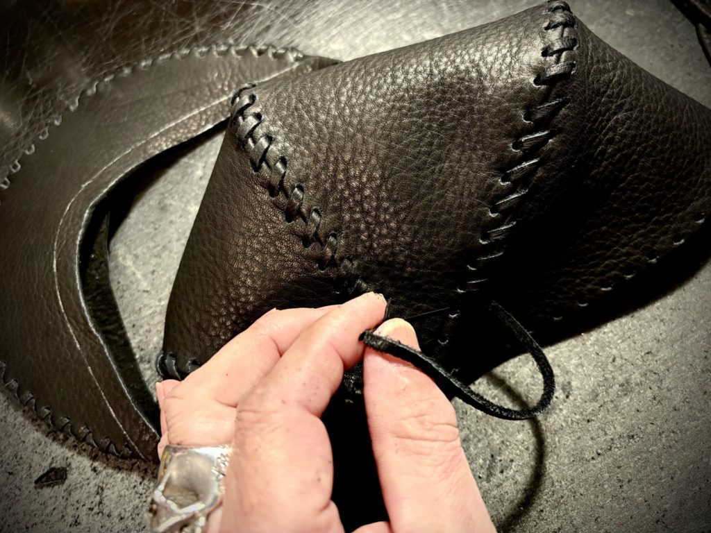 しかし、ハンドレーシングという技法で一針ずつ紐を編み込んでいくことで、ミシンでは決して出せない「鼓動」のようなリズムと強度が宿ります。