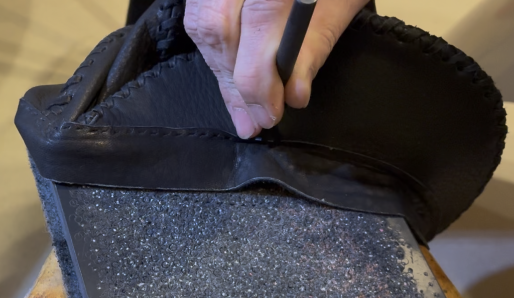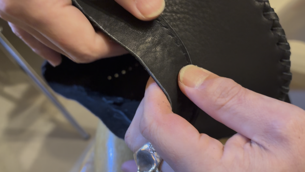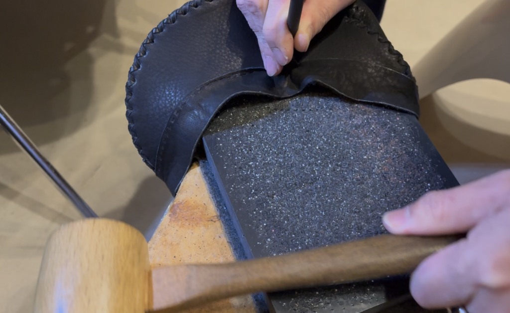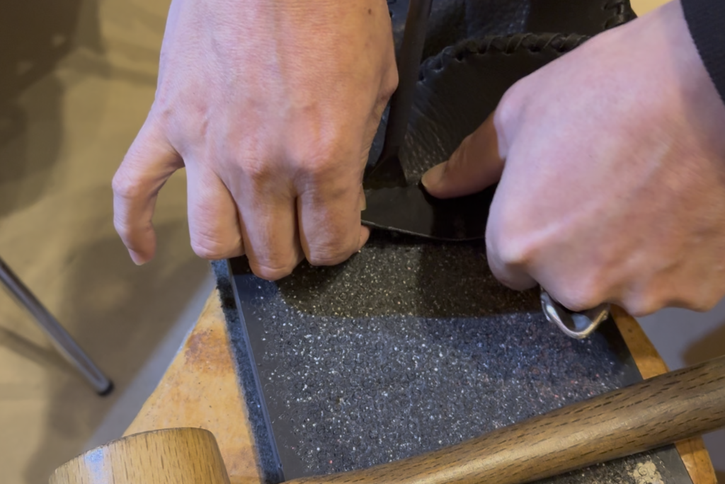過去3回に渡りレザー帽「PRIDE-001」の制作の様子をノーカット動画でお届けしおてまいりました。そして今回はその4、菱目でパーツに穴を貫通させる工程になります。