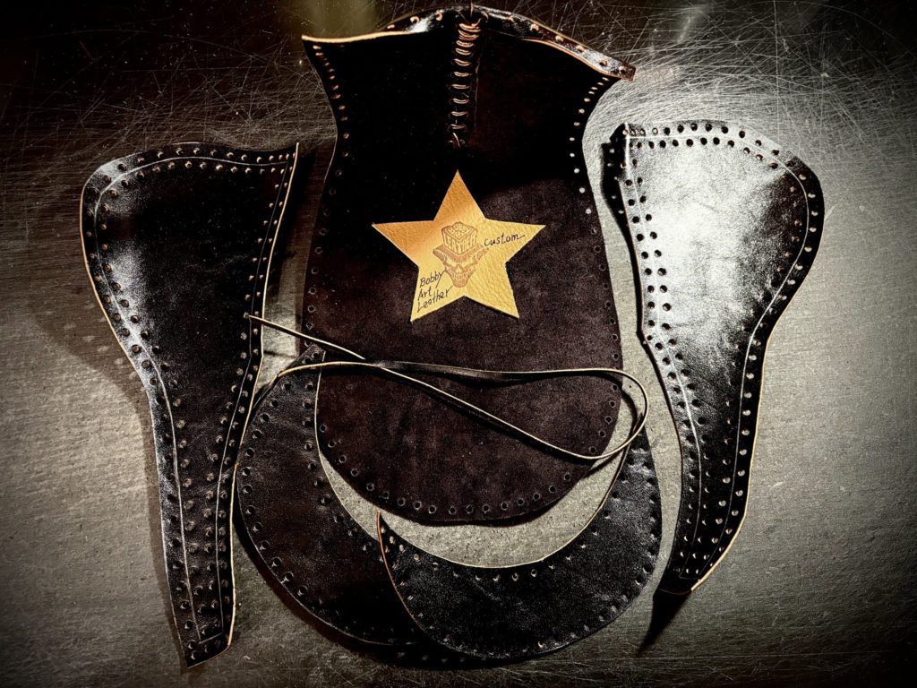 ボビーアートレザーの作品はすべて70年代のファッションカルチャーに見られたハンドレーシングという完全手作業から生まれています。時間も労力も半端なく、集中力と根気を要します。