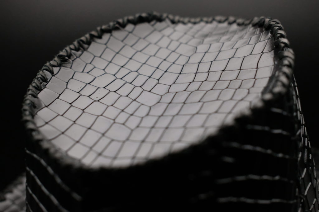 単に革紐を穴に通して繋ぐわけではなく、革紐を編み込むことによって生まれた柄や立体感が